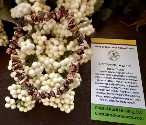 (Jaguar Stone) Helps in connecting with animal kingdom, both in physical and spiritual planes. Useful in shamanism to discover personal totems. Aids in out of body experiences and journeying. A powerful protection stone. Physically gives strength and vitality. Good for chronic health problems. Helps with stabilizing chaos, and bringing harmony into ones life. Excellent for body layouts.